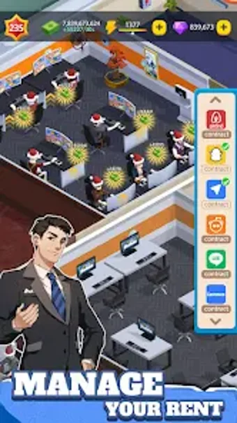 بتراكم رأس المال، يمكنك البدء في المزايدة على الأراضي، شراء المدينة، والاستثمار في المشاريع المحتملة. ومع ذلك، كن حذرًا من منافسيك واستخدم الاستراتيجية الأكثر ملاءمة لدفع أقل مبلغ ممكن مقابل أفضل أرض. في رجل أعمال كسول، يمكنك مشاهدة عمل موظفيك اليومي، ولكن عليك أن تكون على علم بأن مزاجهم يمكن أن يؤثر على دخل الشركة بأكملها. يمكنك أيضًا اختيار الأعمال المحتملة التي تعتقد أنها ستنجح ونقلها إلى مبناك للمضي قدمًا معًا.